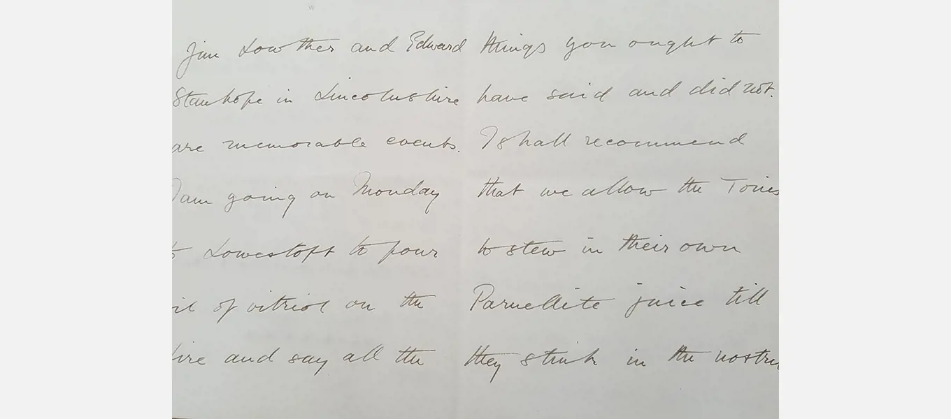 After learning Lord Salisbury’s Conservative Party had lost the Lowestoft seat to the Liberal Party, Lord Harcourt writes that he “shall recommend that we allow the Tories to stew in their own Parnellite juice till they stink in the nostrils of the country and then we will fling them, dishonoured and disgraced to the constituencies and make an end of Toryism for a generation”. He also added that he was going to Lowestoft himself to “pour oil of vitriol on the fire”, something he believed Hartington should have done himself.