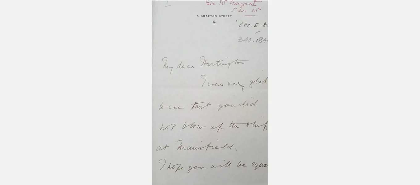 Collections Volunteer Vikki O’Neill is working on a project to catalogue the 8th Duke of Devonshire’s correspondence and came across a surprising letter written by the Liberal politician Sir William Harcourt. Addressed to Spencer Compton Cavendish, then Marquess of Hartington and later the 8th Duke of Devonshire the letter is dated 5 December 1885 and concerns the General Election of that year.