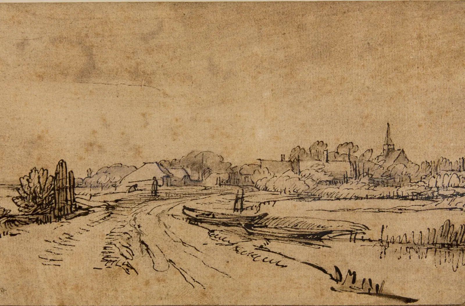 Images: Rembrandt van Rijn drawings: Bend in the Amstel near Kostverloren House; View of Sloten; A thatched cottage by a large tree, a figure seated outside
