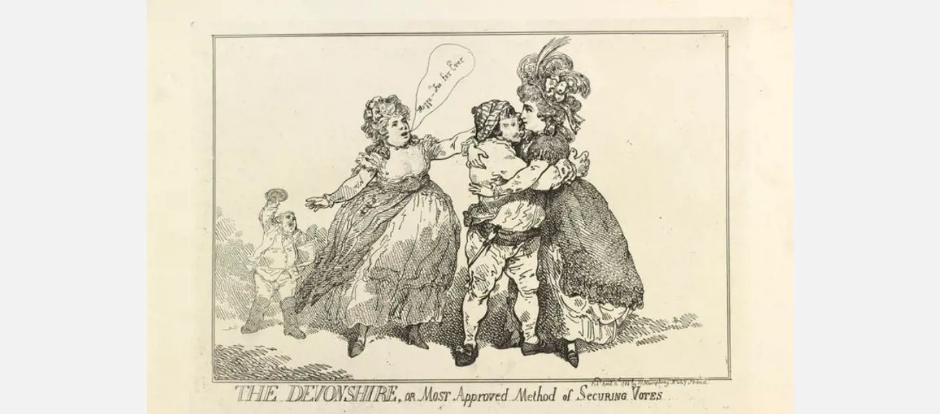 'The Devonshire, or most approved method of securing votes', satirical cartoon by Thomas Rowlandson. 1784